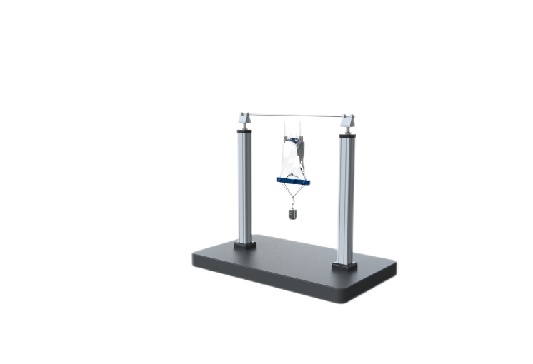將(jiāng)兩條帶子安裝到固定支撐上,使安裝點在(zài)同一水(shuǐ)平高度上,同時與被測(cè)貯尿袋問